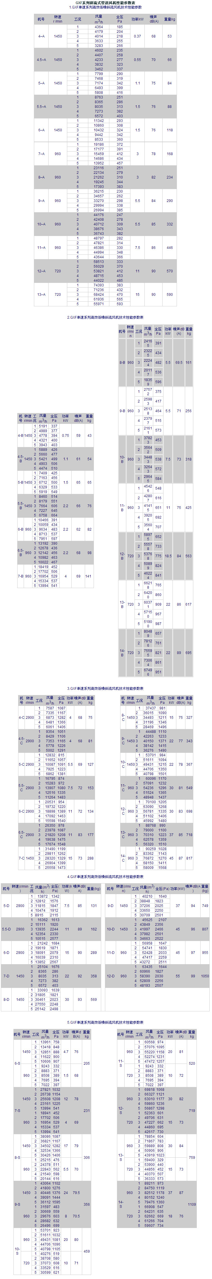 1.GXF單速系列高效低噪斜流風機技術性能參數